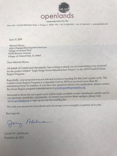 The Village is currently working on plans for the Eagle Ridge Green Infrastructure Project. This project would be a good match for the ComEd Green Region grant as it would focus heavily on the establishment of pollinator habitat as well as incorporate interpretation components, such as educational site signage, that inform the public about both pollinators and green infrastructure. The total project cost is estimated at $85,000 and is intended to help address flooding issues near the Eagle Ridge Park and Eagle Ridge subdivision through a comprehensive green infrastructure approach.