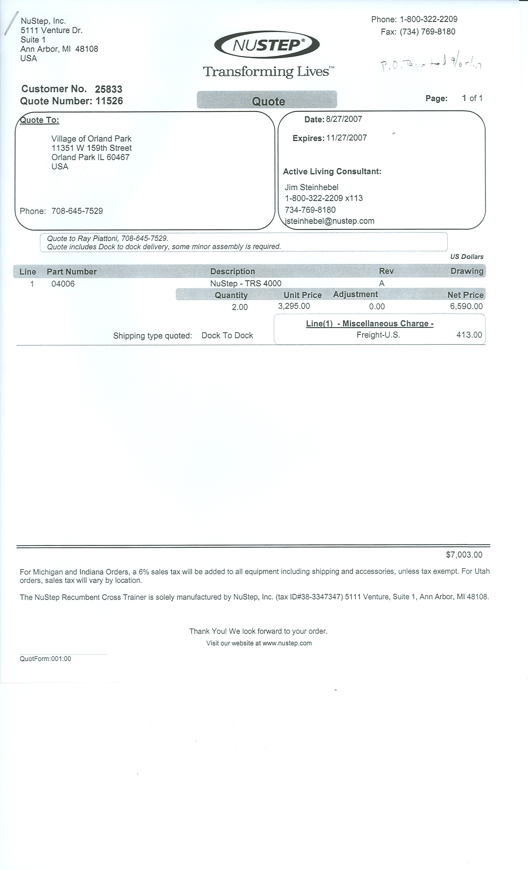 The total cost of the two steppers (including delivery) is $7,003.00. Additional quotes were not available because the NuStep cardio equipment is unique and only available through the manufacturer.
